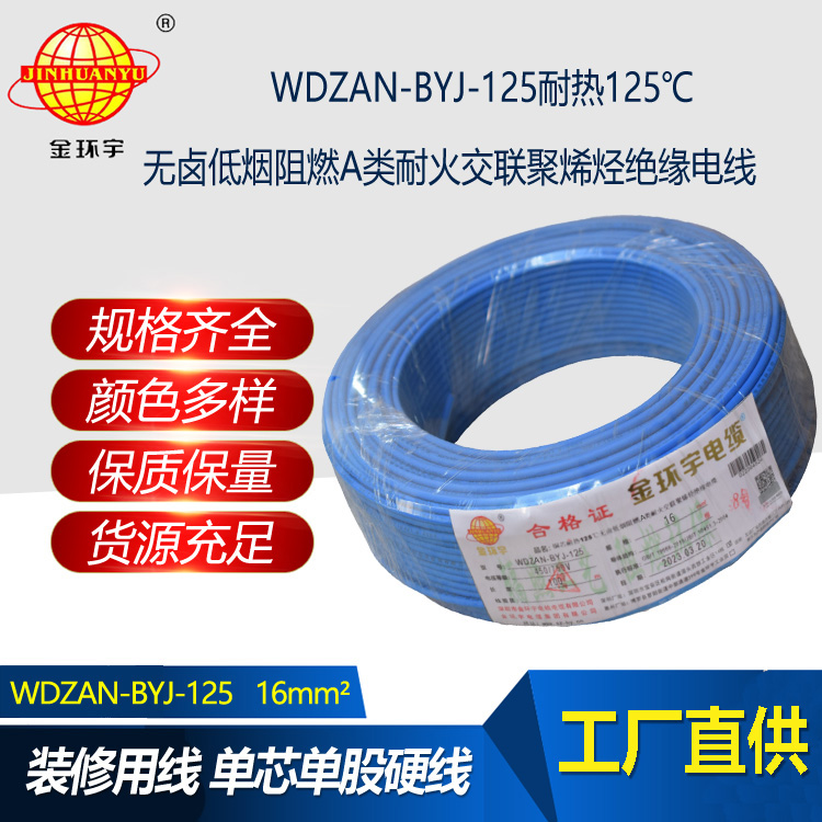 WDZAN-BYJ-125:即為銅芯耐熱125℃無鹵低煙阻燃A類耐火交聯聚烯烴絕緣電線,是指電線的絕緣層材料鹵素物質,在燃燒的情況下,不釋放含鹵氣體,煙霧濃度低,參照標準為JB/T 10491-2004,型號有WDZAN-BYJ-125、WDZBN-BYJ-125、WDZCN-BYJ-125等,