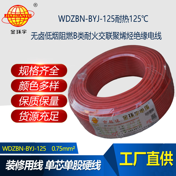 WDZBN-BYJ-125:即為低煙無鹵阻燃B類耐火電線,是指電線的絕緣層材料鹵素物質,在燃燒的情況下,不釋放含鹵氣體,煙霧濃度低,參照標準為JB/T 10491-2004,型號有WDZAN-BYJ-125、WDZBN-BYJ-125、WDZCN-BYJ-125等,