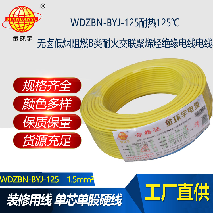 WDZBN-BYJ-125:即為低煙無鹵阻燃B類耐火電線,是指電線的絕緣層材料鹵素物質,在燃燒的情況下,不釋放含鹵氣體,煙霧濃度低,參照標準為JB/T 10491-2004,型號有WDZAN-BYJ-125、WDZBN-BYJ-125、WDZCN-BYJ-125等,