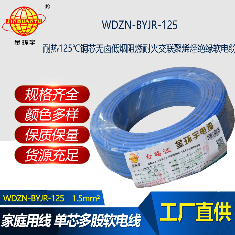 WDZN-BYJR-125是一種交聯(lián)聚乙烯新型裝修的布電線。WDZN-BYJR-125布電線的特點就是低煙量、無鹵素、阻燃、耐火。每個字母代表的意思:W代表無鹵;D代表低煙;Z代表阻燃;N代表耐火;125代表溫度可達到125℃,YJ代表交聯(lián)聚乙烯絕緣;R代表軟。其導體主要是銅線,有薄的絕緣層和良好的電氣機械性能,以及耐熱、防潮、耐溶劑等性能,選用不同的絕緣材料可獲得不同的特性。