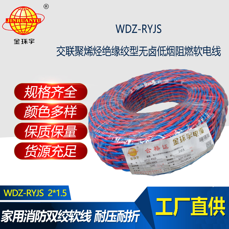 WDZ-RYJS :是銅芯低煙無鹵阻燃交聯聚烯烴絕緣絞型連接軟線。是消防用阻燃聚烯烴絕緣連接軟線是參照GB/T5023-2008等標準制訂的,其阻燃特性符合GB/Tl9666類的要求。