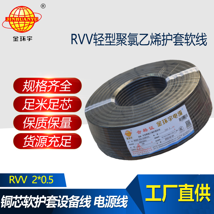 RVV2*0.5平方電纜是2根0.5平方銅芯交聯(lián)聚乙烯絕緣聚氯乙烯護(hù)套電力電纜,帶阻燃特性。阻燃—ZR 阻燃A類,阻燃B類,阻燃C類。金環(huán)宇電線電纜產(chǎn)品上千種,歡迎來(lái)電咨詢。