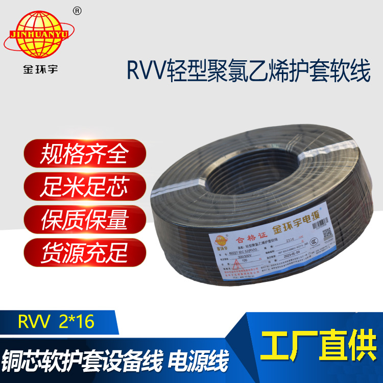 RVV2*16平方電纜是2根16平方銅芯交聯(lián)聚乙烯絕緣聚氯乙烯護(hù)套電力電纜,帶阻燃特性。阻燃—ZR 阻燃A類,阻燃B類,阻燃C類。金環(huán)宇電線電纜產(chǎn)品上千種,歡迎來(lái)電咨詢。